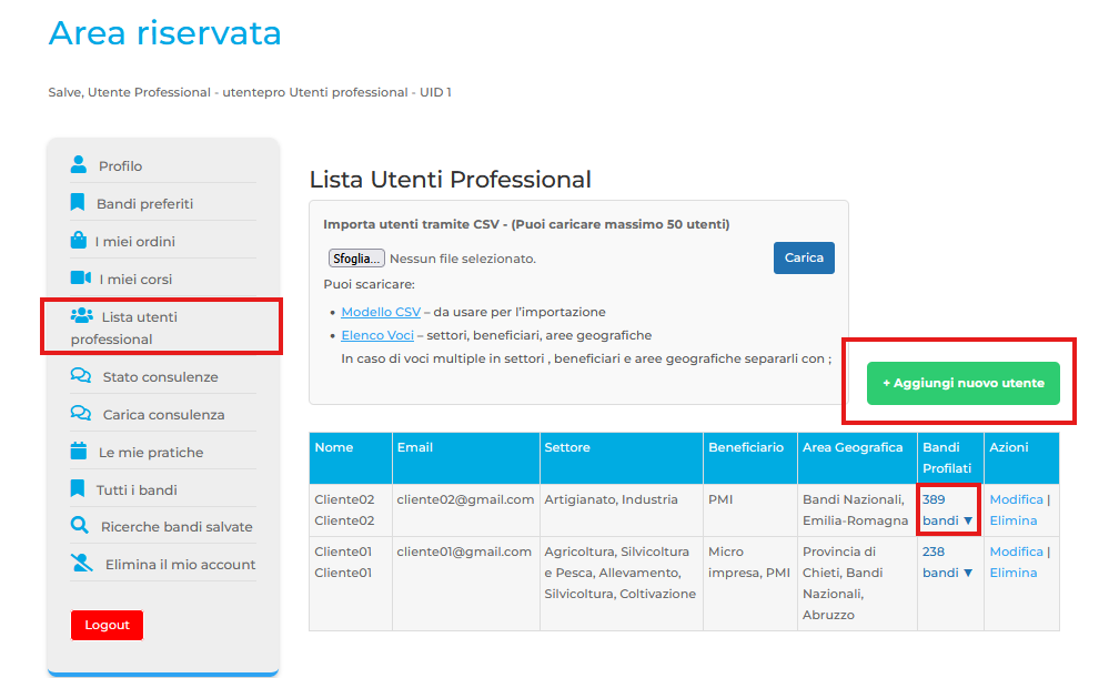 Carica fino a 50 clienti profilati e scopri con un clic i bandi disponibili per lui